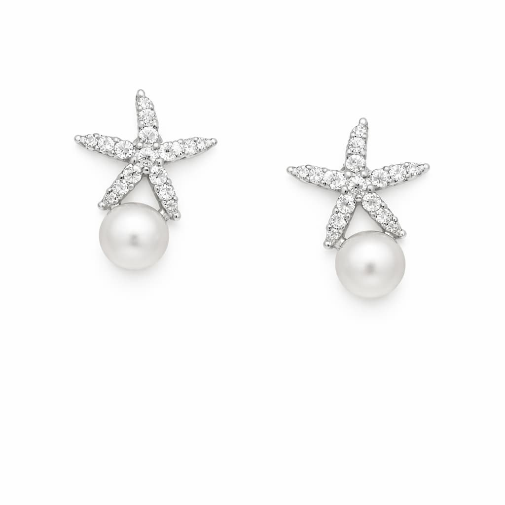 Cercei din argint 925 cu stea de mare și perlă de cultură, bijuterie elegantă inspirată din ocean. Accesoriu feminin, ideal pentru cadou sau purtare zilnică.