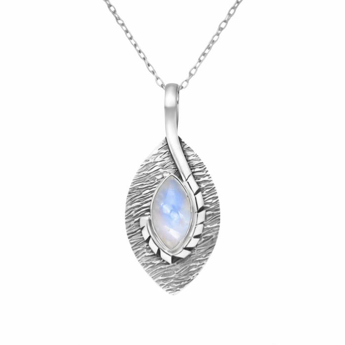 Pandantiv Moonstone din argint 925 în formă de frunză, cu piatra lunii irizată. Elegant, mistic și simbol al intuiției și noilor începuturi.