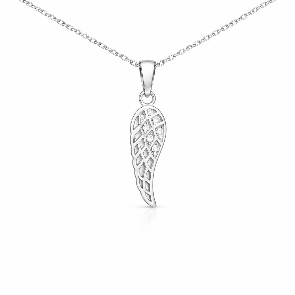 Pandantiv Aripă de Înger din argint 925 rodiat cu zirconiu, simbol al protecției și speranței. Bijuterie elegantă, hipoalergenică, ideală pentru cadou.